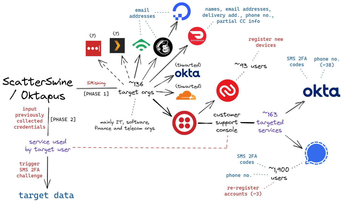 A visual depiction of the attacks by the SMS phishing group known as 0ktapus, ScatterSwine, and Scattered Spider. Image: Amitai Cohen twitter.com/amitaico.